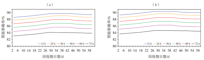 2种订正算法12~72 h预报时效逐12 h的降水预报准确率随滑动训练期的变化