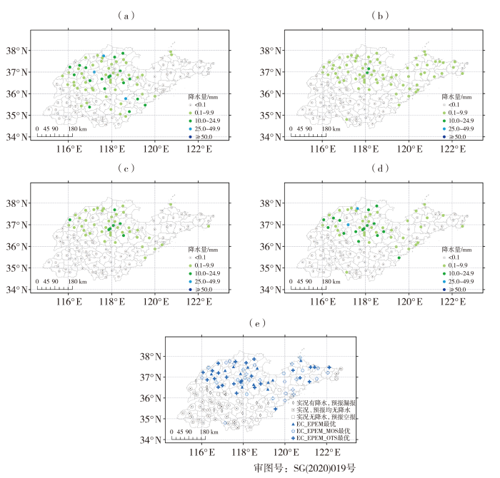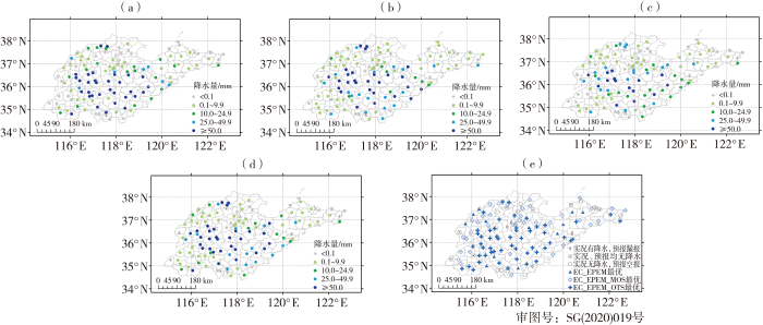 2020年9月7日20:00至8日08:00山东中北部有小到中雨,局部大雨天气。从图9可见,ECMWF集合降水预报山东西北、中部和半岛地区有小雨,局部大雨,半岛地区出现大范围空报,其他地区降雨量级偏小,EC_EPEM对小量级的空报问题较突出;EC_EPEM_MOS订正预报有效地减小了EC_EPEM在半岛地区的小雨空报及山东东北部分站点的中雨漏报;EC_EPEM_OTS订正预报改善了半岛部分地区小雨空报,对山东西北和中部山区北部的中雨漏报问题订正效果明显。根据预报偏差选取最优方法,EC_EPEM_MOS对EC_EPEM在小量级上的空报问题订正效果较好。