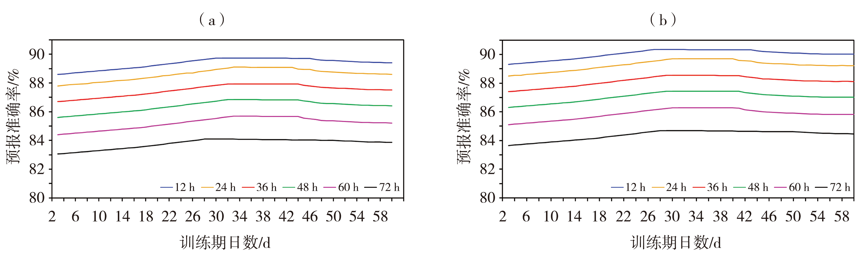 | 图1 2种订正算法12~72 h预报时效逐12 h的降水预报准确率随滑动训练期的变化 (a)EC_EPEM_MOS,(b)EC_EPEM_OTS |