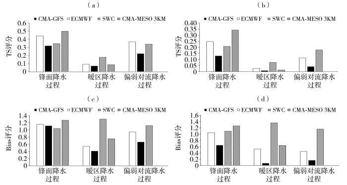 3类降水过程大雨(a、c)和暴雨(b、d)各模式预报的TS(a、b)和Bias(c、d)评分