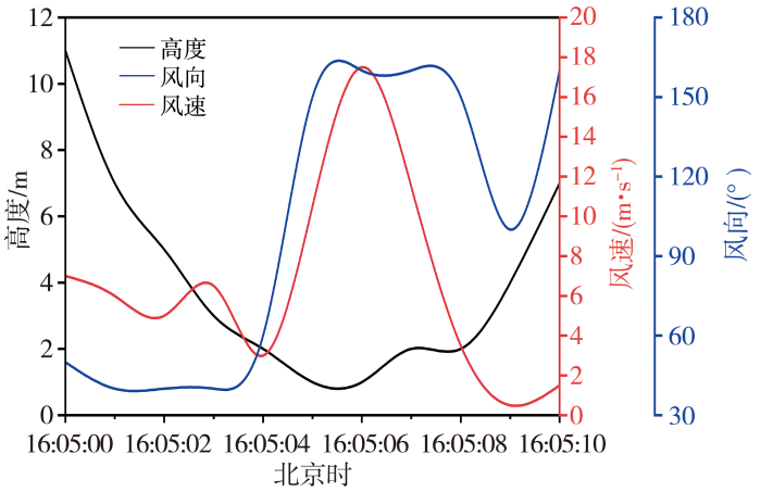 由2021年3月30日16:05:00—16:05:10飞机在遭遇低空风切变10 s内离跑道高度、空中风速及风向变化(图7)可看出,16:05:04飞机高度下降至距跑道道面2.0 m高度,风向为55°并相对飞机落地方向为右侧风,风速为3.0 m·s-1,当飞机继续下降至约1.0 m高度时,风向转变为87°,风向从右侧风变为顺风,16:05:05当飞机即将着陆、距离跑道高度仅有0.6 m时,风向转变为153°左侧风,风速增大至10.8 m·s-1,16:05:06风速突增至17.8 m·s-1、风向为160°,此时机组立即执行复飞,复飞后3 s内(16:05:07—16:05:10)随着飞机高度上升风速急剧减小,降低至0.5 m·s-1。从以上变化可以发现,飞机在落地前几秒风向从右侧风转为顺风再转为左侧风,呈顺时针变化,风速由3.0 m·s-1突增至17.8 m·s-1,随后短时间内突降,可见水平风速突增的过程中存在较强的水平风切变。同时,飞机在2.0 m和0.6 m高度的垂直风速差达20.8 m·s-1,根据国际民用航空组织推荐的风切变强度标准判断(张利平等,2012;国际民用航空组织,2018),飞机在3.0 m以下和复飞过程中遭遇了强风切变,包括强水平风向、风速的切变和强垂直风切变。