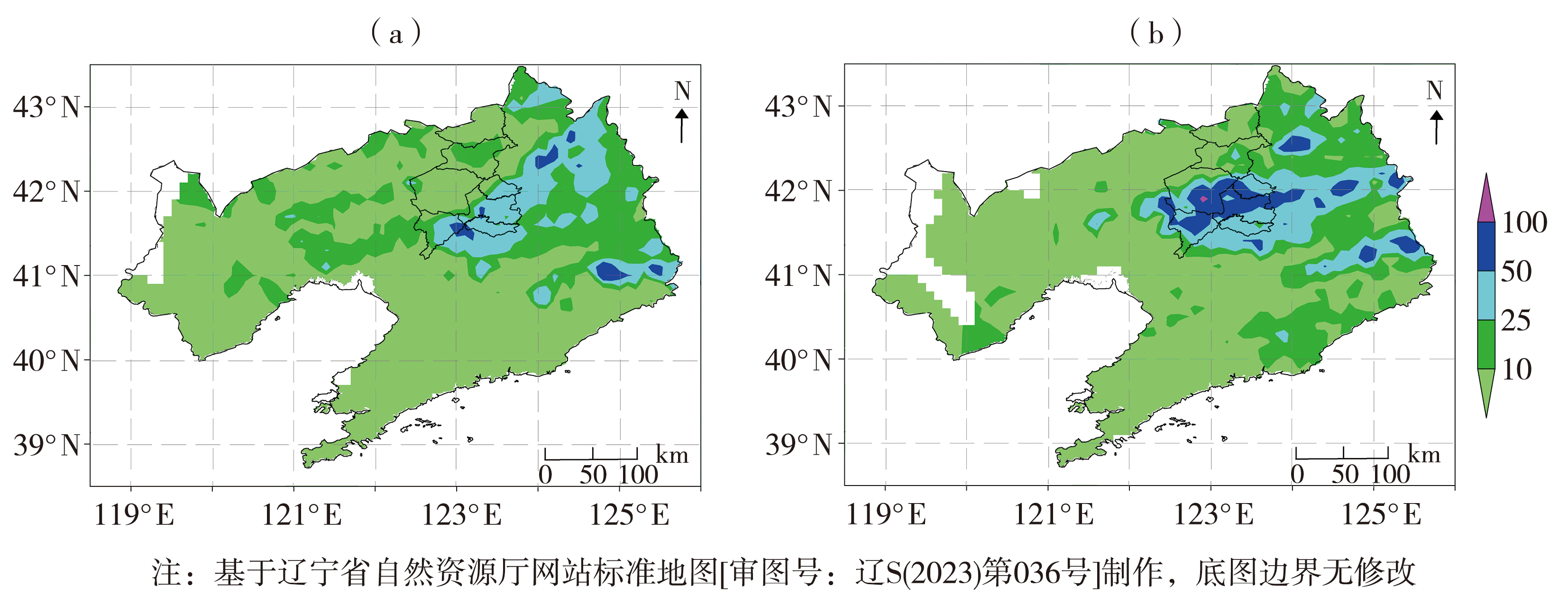 | Fig.1 Distribution of precipitation from 15:00 to 20:00 on June 30, 2016 (a) and from 17:00 on August 3 to 01:00 on August 4, 2020 (b) in Liaoning Province (Unit: mm) |