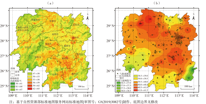 2002—2021年遥感监测年地表高温极端阈值(a)和1991—2020年气象站极端气温阈值(b)分布