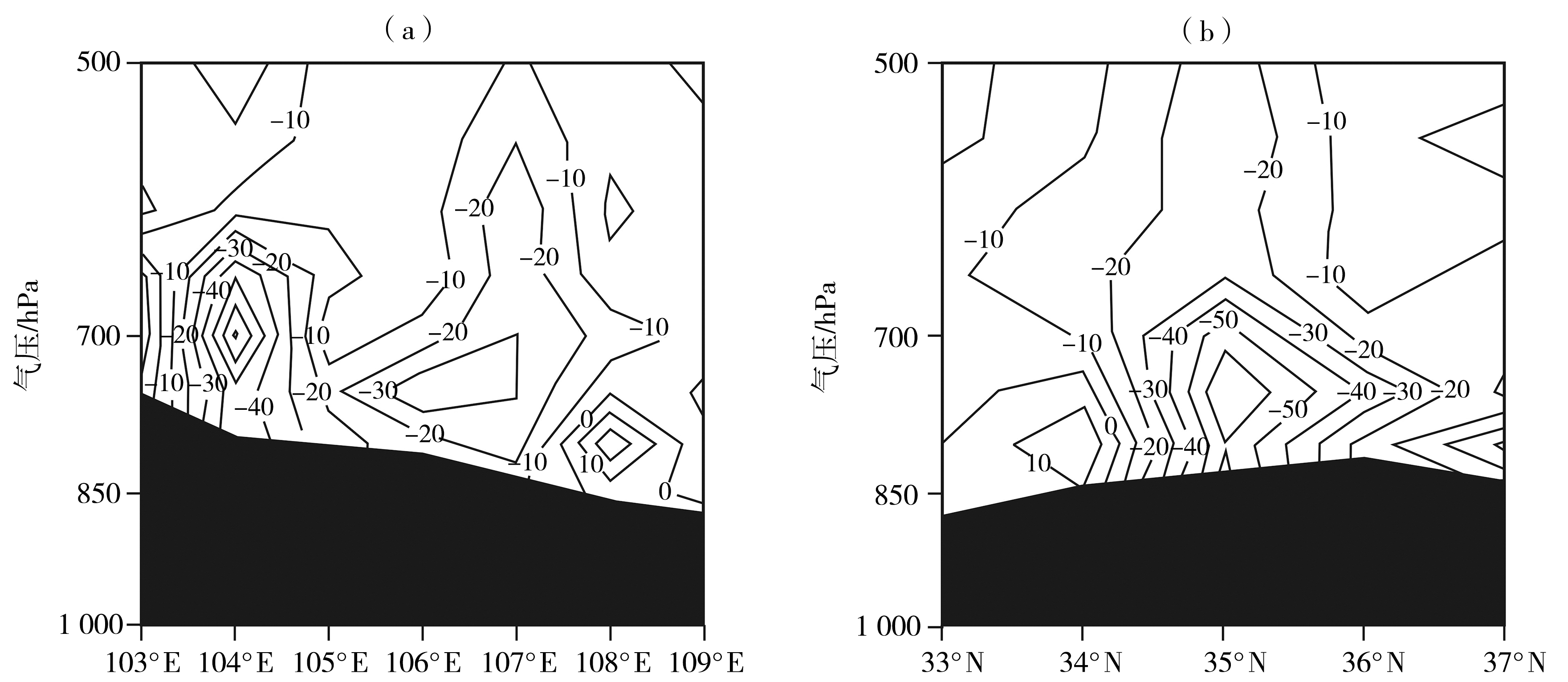 | 图5 1989—2018年六盘山地区垂直速度分别沿35.67°N(a)、106.20°E(b)的垂直剖面(单位:Pa·s-1) (黑色填色为地形) |
