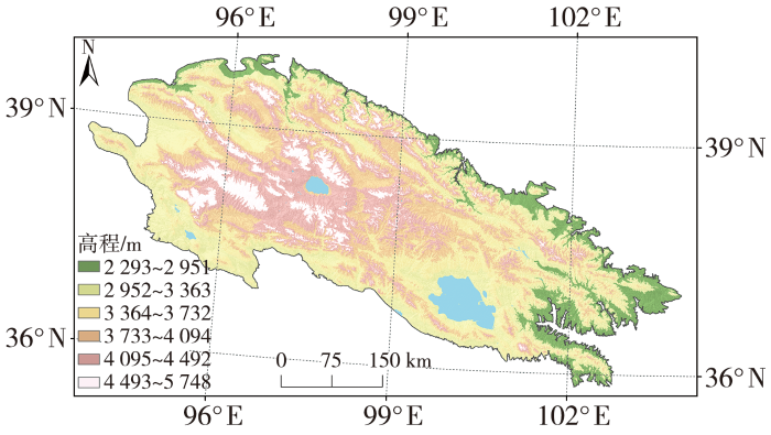 图2为祁连山地区生长季土地利用和NDVI的多年平均。可以看出祁连山地区的土地利用类型主要有裸地、草地和农田等。NDVI总体呈现西北低、东南高的空间分布特征。其中,裸地的NDVI为0~0.2,草地生长季平均NDVI为0.1~0.7,耕地生长季平均NDVI相对较高,达到0.8以上。祁连山东段和中段区域以草地为主,对应的NDVI为0.4~0.8;祁连山西段区域植被稀疏,以裸地为主,对应的NDVI小于0.2。NDVI高值区位于祁连山东段,并向西逐渐减小,说明中段和西段植被相对东段稀疏,生态环境更脆弱,更易受气候变化影响。祁连山生长季平均NDVI呈现自东向西逐渐减小的趋势,可能与祁连山东段降水多、土壤水分较丰富有关(黄波,2012)。