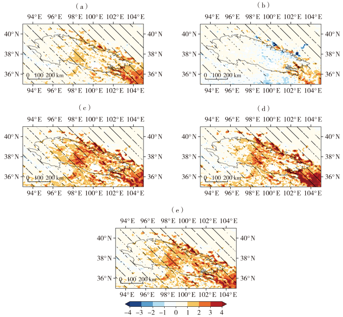 1982—2022 年祁连山全年(a)、春季(b)、夏季(c)、秋季(d)、生长季(e)NDVI变化趋势的空间分布(单位:×10-3 a-1)