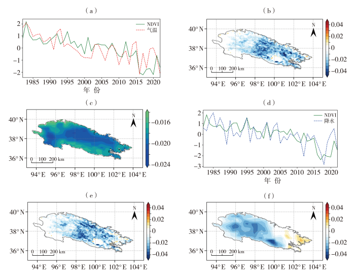 1982—2022 年祁连山夏季NDVI和同时段气温(a、b、c)、降水(d、e、f)SVD第一模态对应的时间系数(a、d),NDVI(b、e)和同时段气温(c)、降水(f)的异性相关系数空间分布