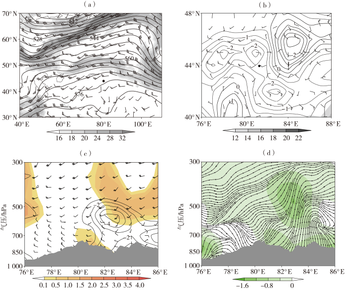 2022年5月5日14:00 500 hPa位势高度场(等值线,单位:dagpm)和风场(风矢,单位:m·s-1)(a)、850 hPa风场(风矢,单位:m·s-1)和地形抬升速度(等值线,单位:Pa·s-1)(b)及5日20:00沿44°N的散度(等值线,单位:10-5 s-1)、涡度平流(填色,单位:10-9 s-2)、风场(风矢,单位:m·s-1)(c)与垂直速度(填色,单位:Pa·s-1)和流场(流线)(d)的剖面