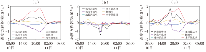 Evolution of individual terms in vorticity equation of original wind (a), geostrophic wind component (b) and ageostrophic wind component (c) at 850 hPa vortex center from 08:00 on 10 to 08:00 on 11 June 2022