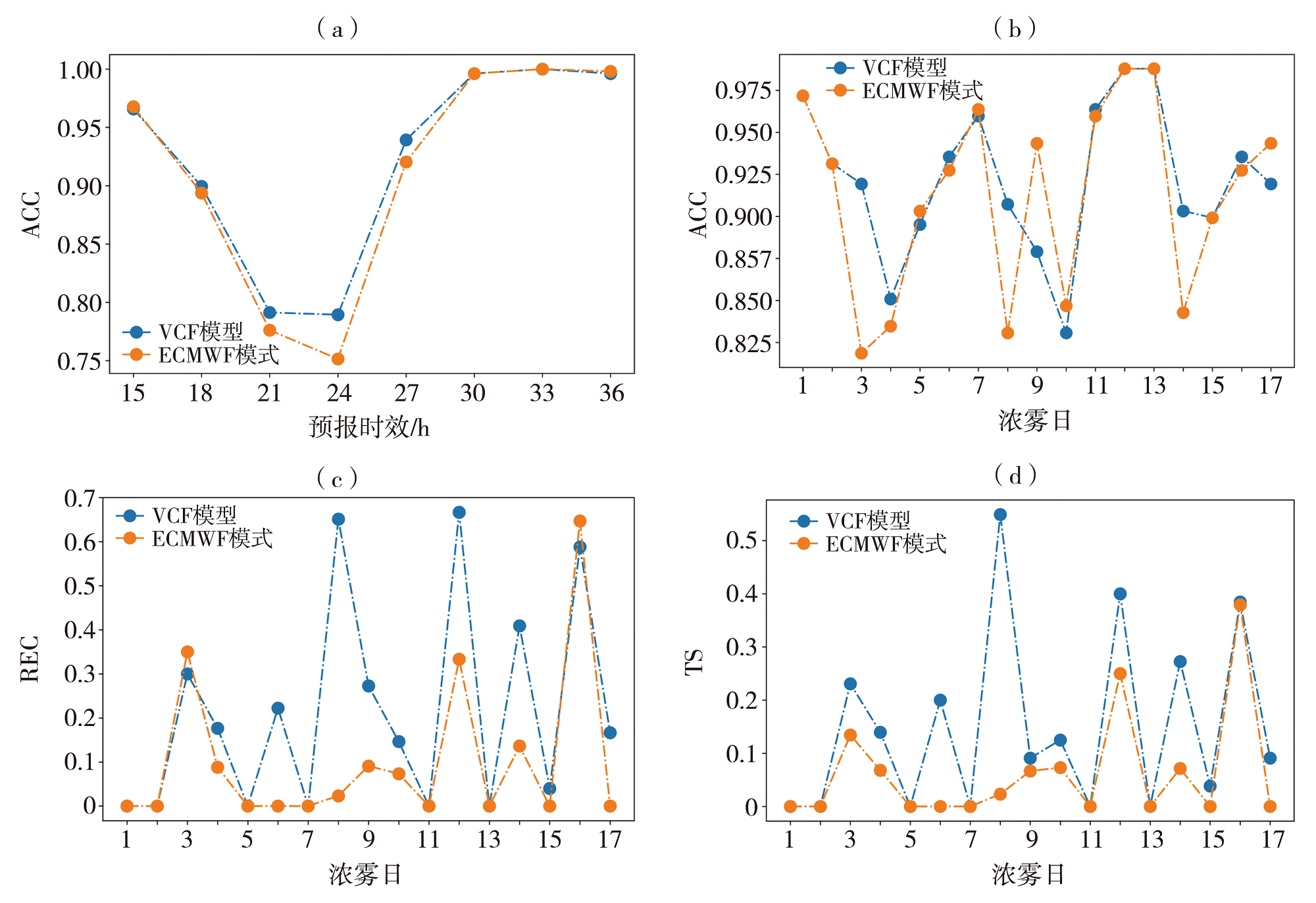 | 图3 2022年1—3月豫南17个浓雾日不同模型不同预报时效的平均ACC(a)及逐日ACC(b)、REC(c)、TS评分(d) |
