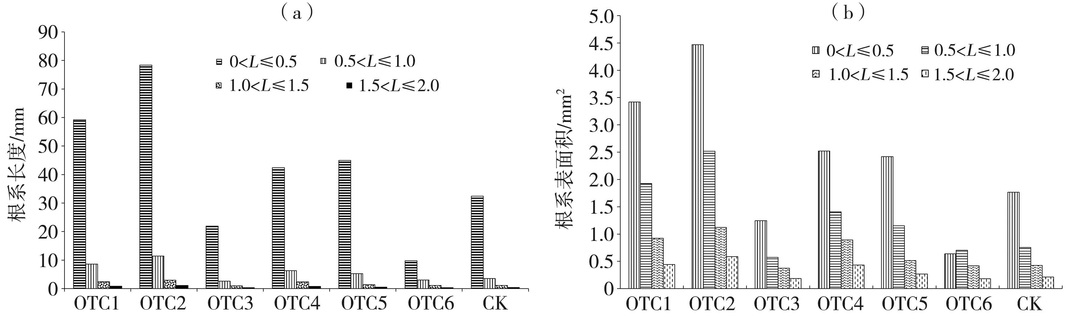 | 图6 6个OTC和对照组4类细根的根长(a)及根系表面积(b) |