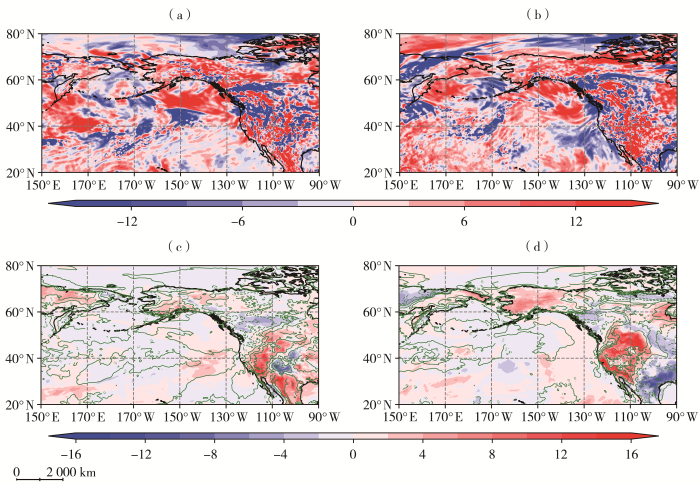 为进一步分析该时段的环流异常特征,图7为2024年7月1—11日平均的200 hPa位势高度扰动场及T-N波活动通量、500 hPa位势高度及水平风扰动场、500 hPa垂直速度异常场、地面气温与水汽压亏损异常场。可以看出,勘察加半岛以东洋面上空的异常高压以能量频散的方式向东传播,在中北太平洋、北美大陆西岸、北美大陆中东部分别形成异常低压、高压与低压[图7(a)]。此外,500 hPa位势高度与水平风的瞬变扰动平均场也呈现出准静止Rossby波[图7(b)],且异常高低压的位置与200 hPa的结果基本吻合,说明上述准静止波呈现出相当正压结构。2024年7月上旬的大气长波活动与5 860 gpm等值线所表现出的槽脊系统相对应[图7(b)],并使得北美大陆西岸上空的位势高度增强,而气候平均态下,北太平洋至北美大陆西岸大气波动较弱。进一步说明2024年7月上旬环流异常扰动强烈。
