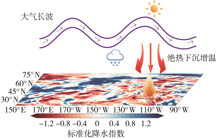 2)天气尺度上,瞬变扰动流场揭示了中高纬度Rossby波传播过程,该过程导致加州上空出现异常高压反气旋,并通过增强绝热下沉增温,使得地表出现暖干异常,加剧了山林火灾发生的风险。