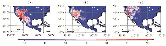 2024年6月15日(a)、7月1—11日(b)、及7月24日(c)美国西部火灾天气指数空间分布