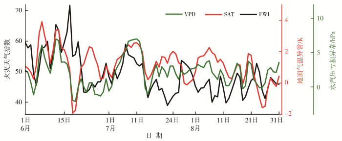 Time series of area mean fire weather index, surface air temperature (SAT) and VPD anomalies in California in summer of 2024
