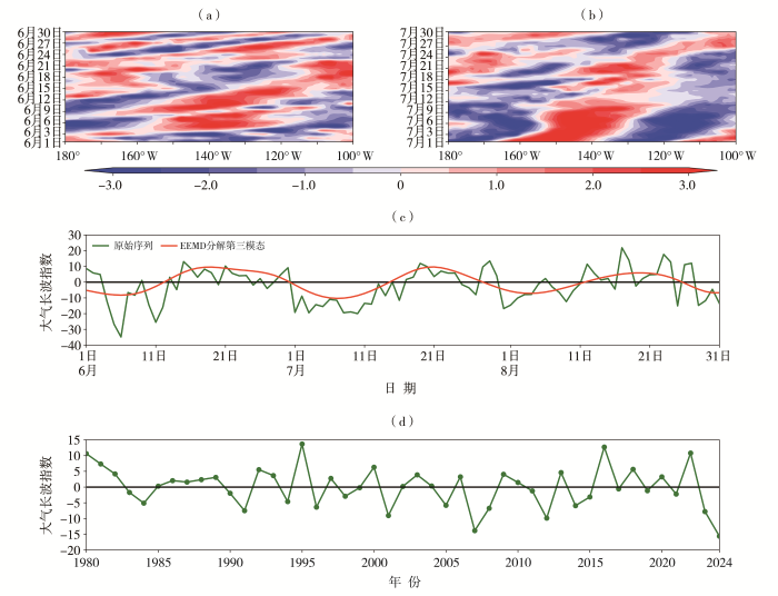 The daily time-longitude sections of transient asymmetric anomalous meridional wind at 200 hPa along 45.75°N in June (a) and July (b) of 2024 (Unit: m·s-1), daily variation of atmospheric long-wave index in summer 2024 (c), and inter-annual variation of atmospheric long-wave index from July 1 to 11 during 1980-2024 (d)