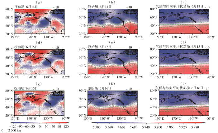 2024年6月14—16日500 hPa位势高度场(填色,单位:gpm)及水平风场(矢量箭头,单位:m·s-1)的天气尺度瞬变扰动场(a、d、g)、原始场(b、e、h)及气候平均与纬向平均扰动场之和(c、f、i)