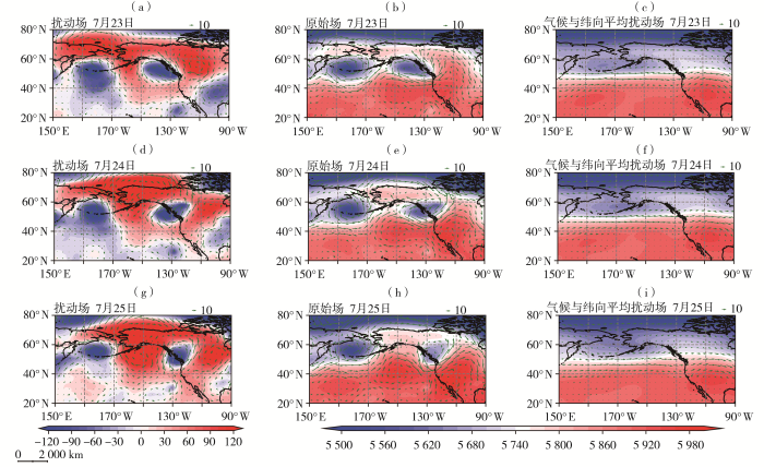 2024年7月23—25日500 hPa位势高度场(填色,单位:gpm)及水平风场(矢量箭头,单位:m·s-1)的天气尺度瞬变扰动场(a、d、g)、原始场(b、e、h)及气候平均与纬向平均扰动场之和(c、f、i)