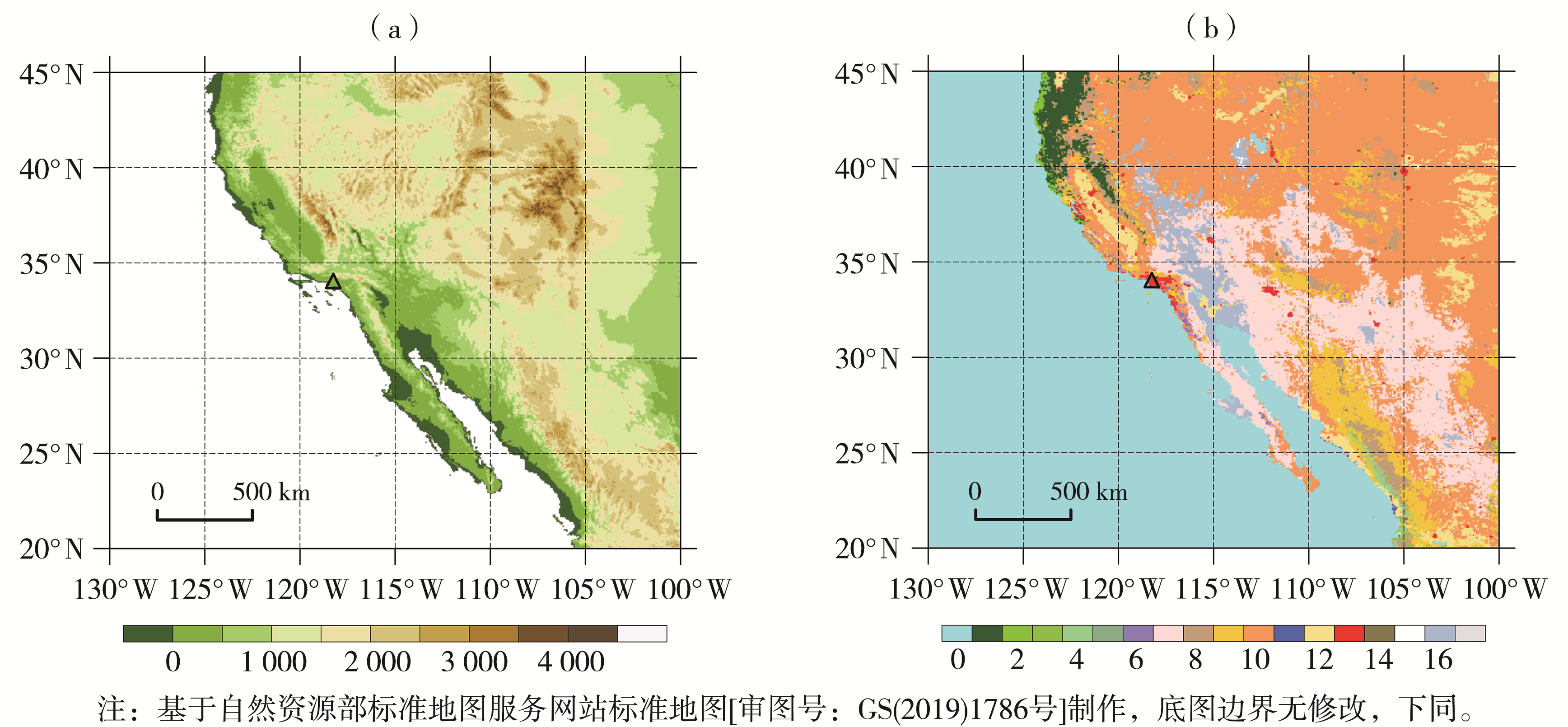 | 图1 美国西部地区地形(a,单位:m)、国际地圈生物圈计划(International Geosphere Biosphere Programme,IGBP)下垫面覆盖类型(b)空间分布 (三角符号表示洛杉矶位置,下同;b图中数字表示IGBP植被覆盖类型依次为:0 水,1 常绿针叶林,2 常绿阔叶林,3 落叶针叶林,4 落叶阔叶林,5 混交林,6 郁闭灌丛,7 开放灌丛,8 多树草原,9 稀树草原,10 草原,11 永久湿地,12 作物,13 城市和建成区,14 作物和自然植被的镶嵌体,15 雪、冰,16 裸地或低植被覆盖地,17 未分类区) |