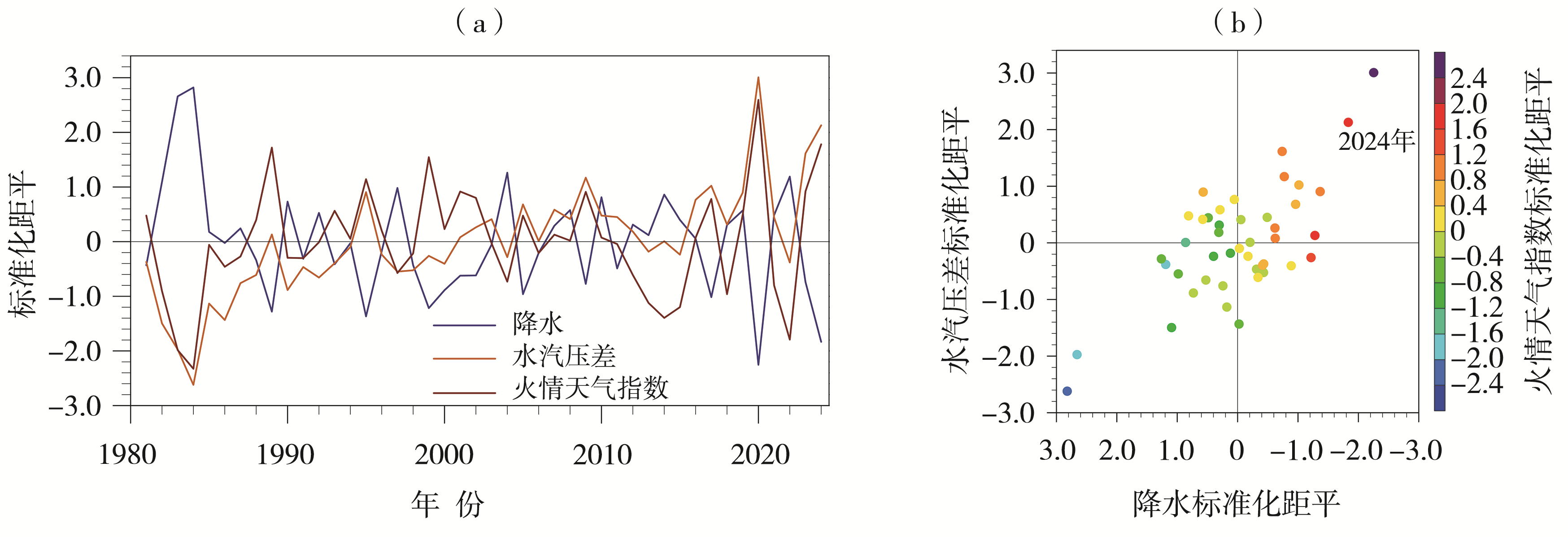 | Fig.5 Time series (a) and scatter plot (b) of standardized anomalies of precipitation, VPD and FWI area-averaged over the western United States (25°N-38°N, 120°W-110°W; the same as below) from July to December during 1981-2024 |