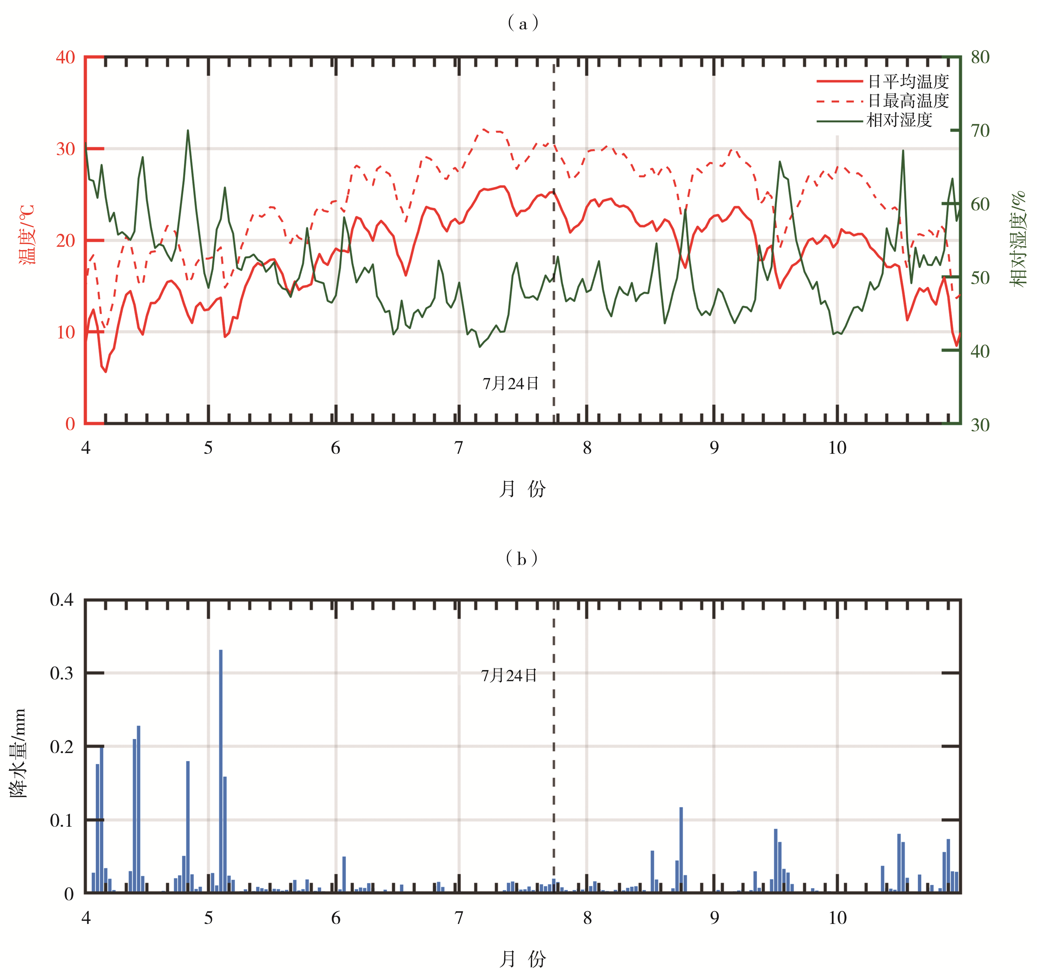 | 图7 2024年4—10月美国加州日平均气温、日最高气温、相对湿度(a)及降水量(b)逐日变化 |