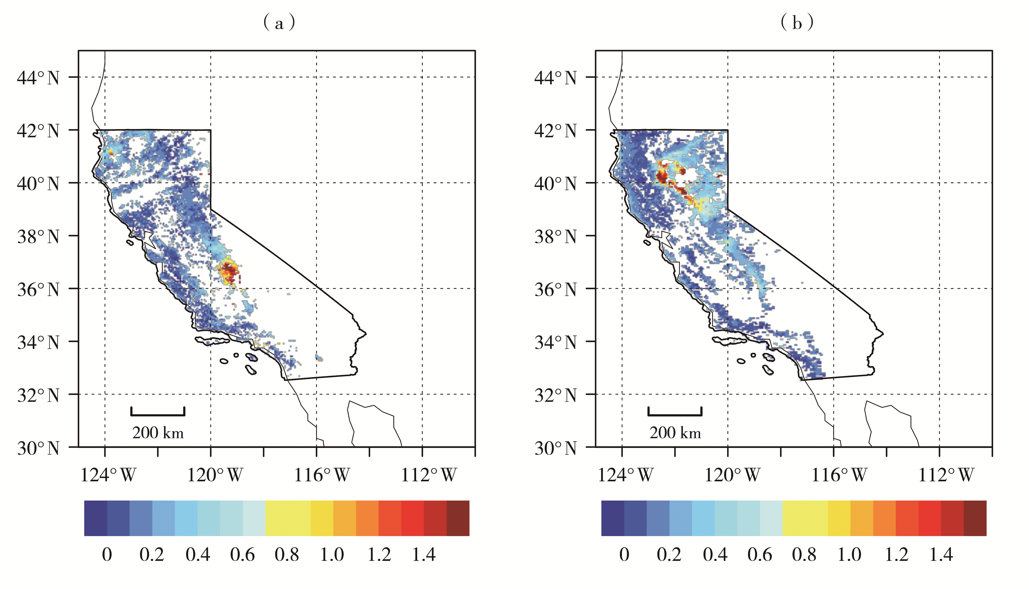 | 图9 2024年7月23日(a)、31日(b)加州山火爆发前后气溶胶光学厚度(AOD)变化 |