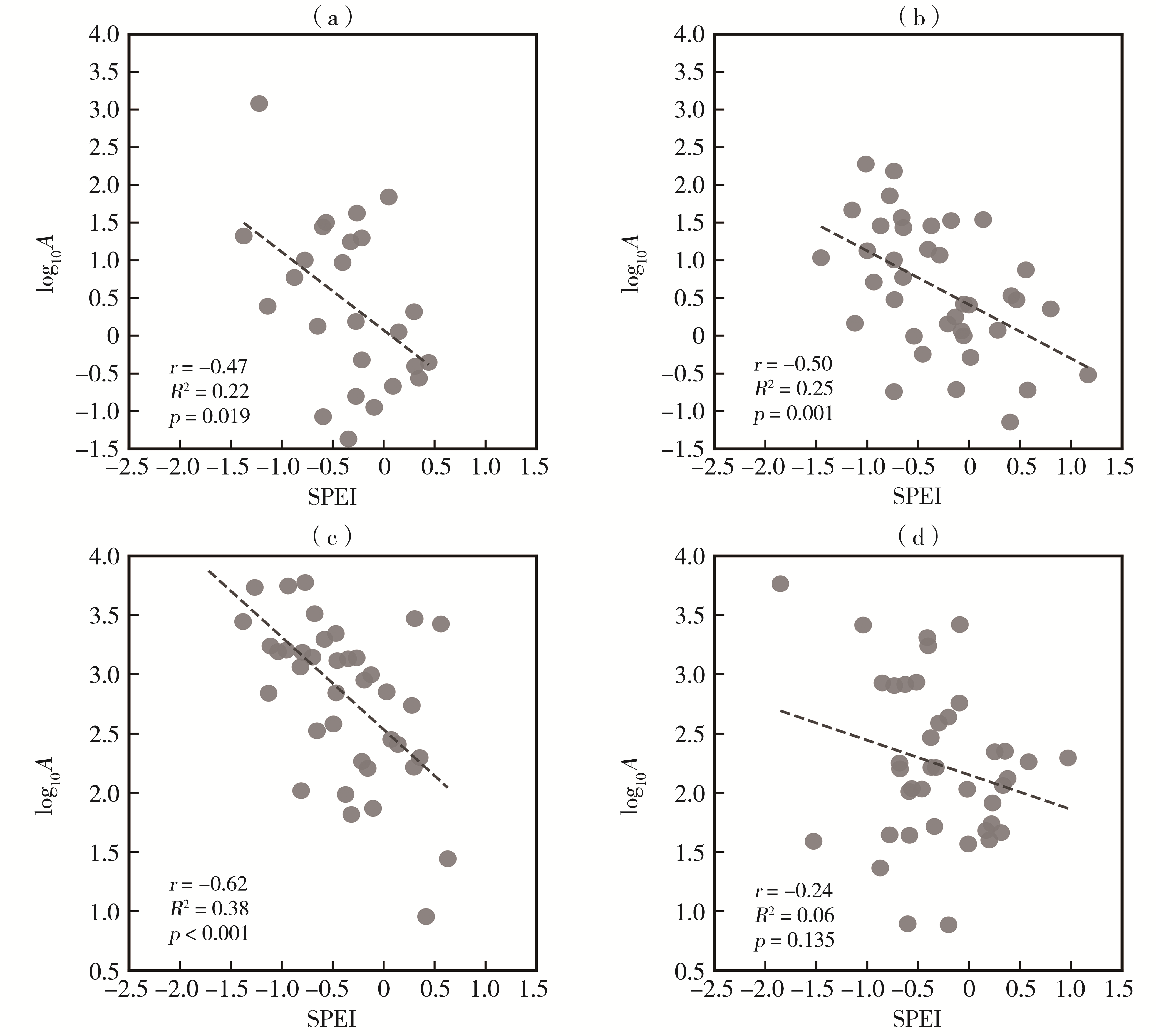 | 图12 1984—2023年不同季节加州标准化降水蒸散指数与log10A的关系 (a)冬季,(b)春季,(c)夏季,(d)秋季 |