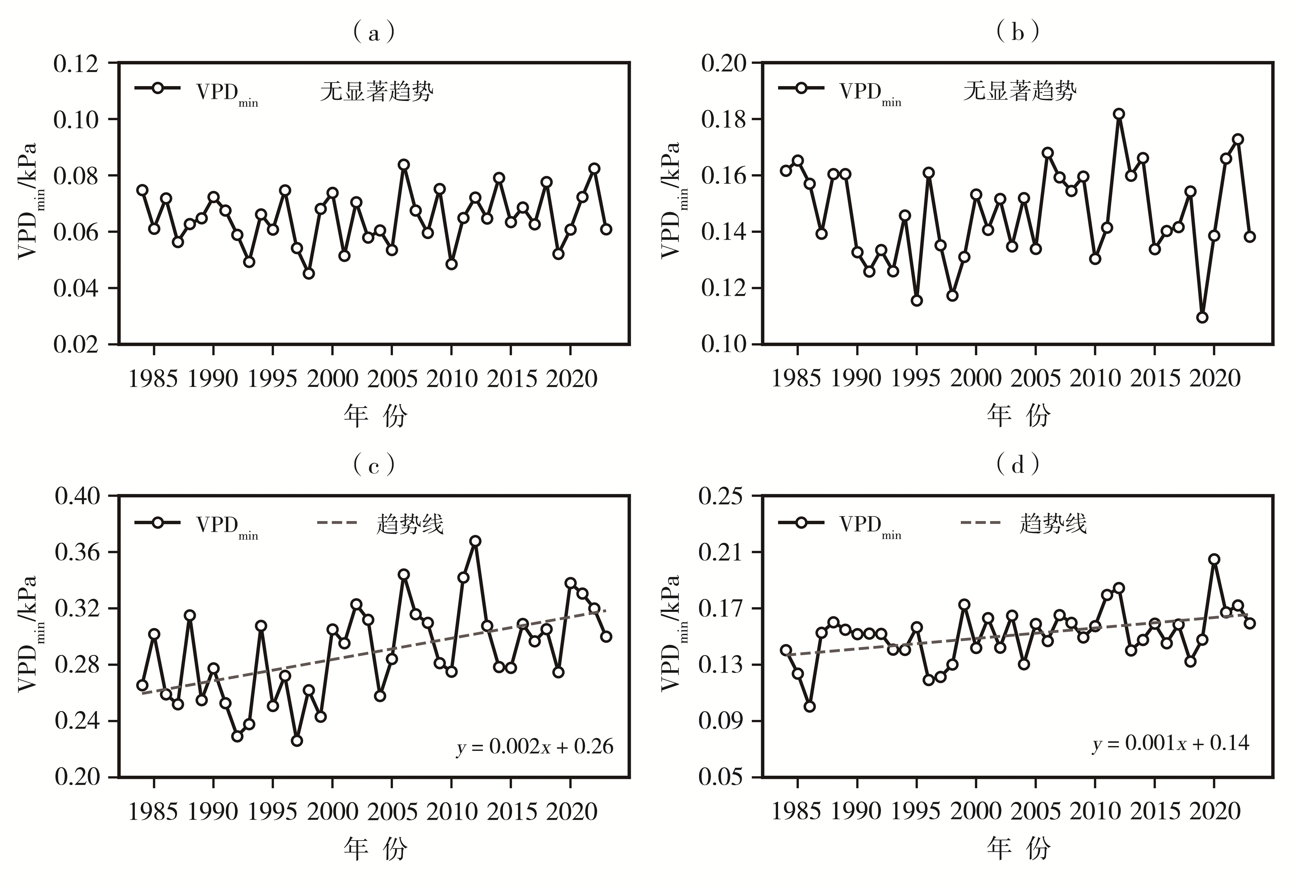 | 图8 1984—2023年不同季节加州最小饱和水汽压差年际变化 (a)冬季,(b)春季,(c)夏季,(d)秋季 |