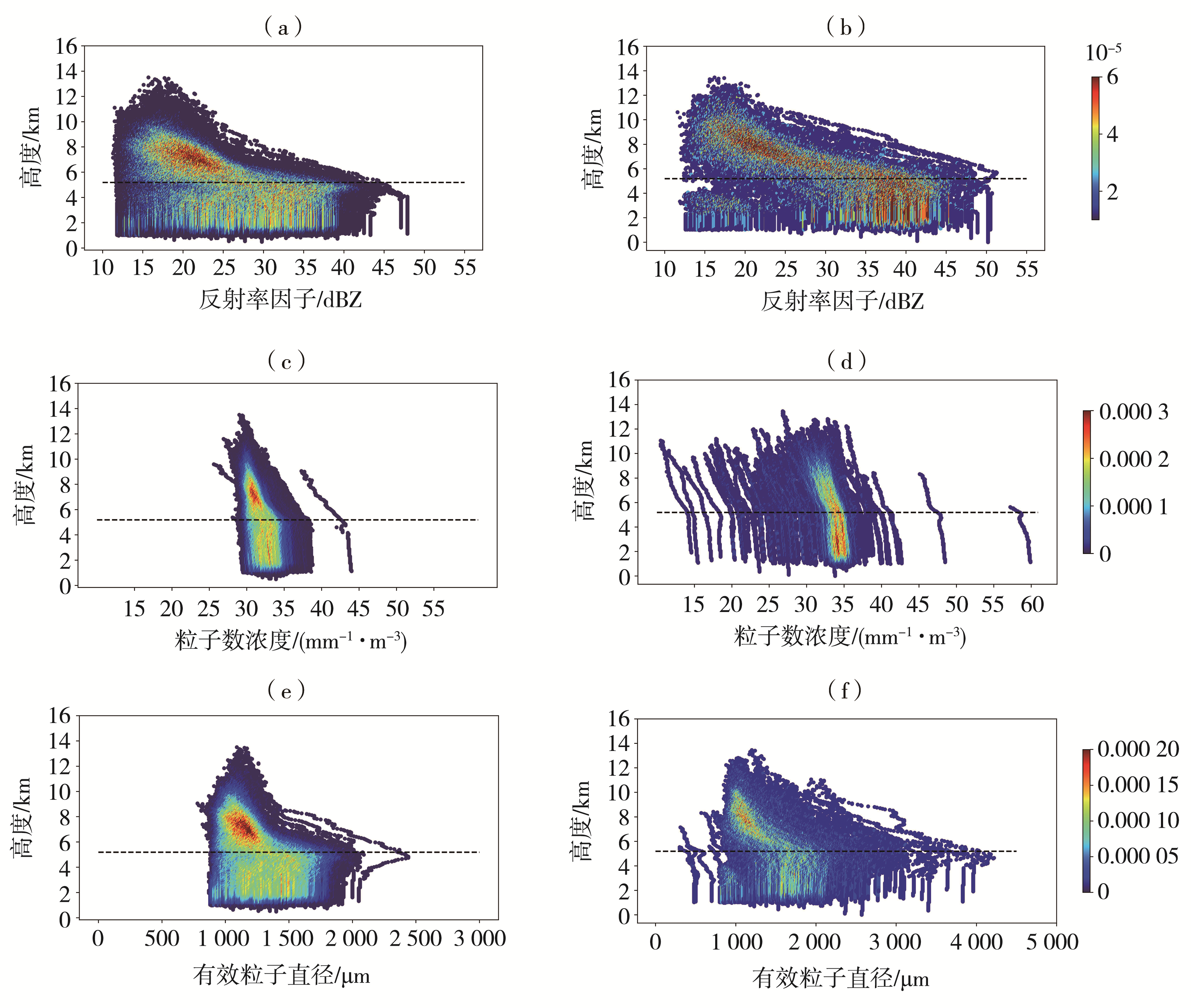 | 图10 2024年8月8日22:00层状云降水(a、c、e)及对流云降水(b、d、f)反射率因子(a,b)、粒子数浓度(c,d)及有效粒子直径(e,f)的归一化等频率高度分布 |