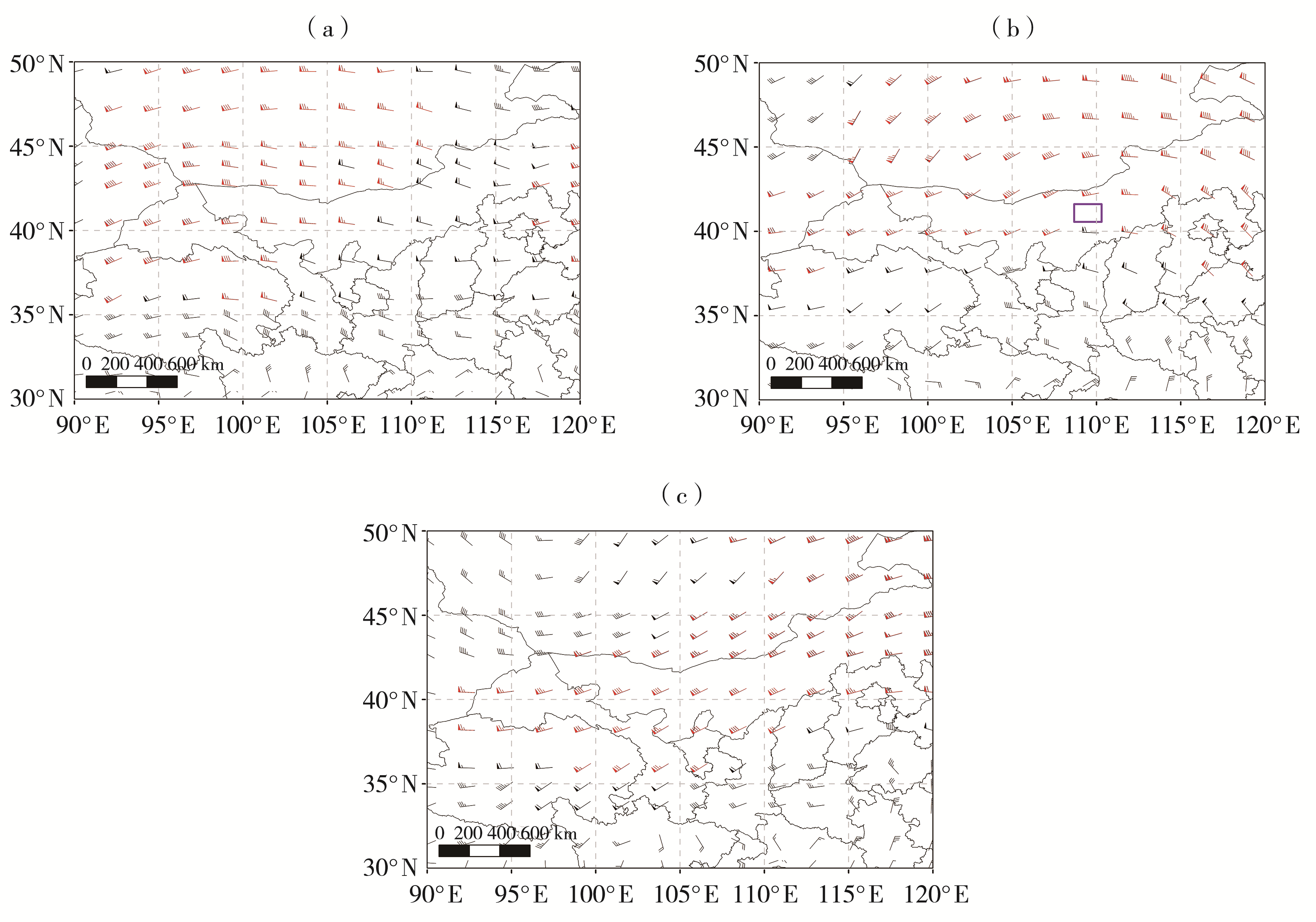 | Fig.2 Upper-level jet (Unit: m·s-1) of 200 hPa at 16:00 on 7 (a), 8 (b) and 9 (c) August 2024 (Red wind vectors are upper-level jets greater than 30 m·s-1, the purple box indicates rainstorm center location) |