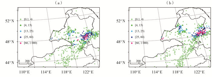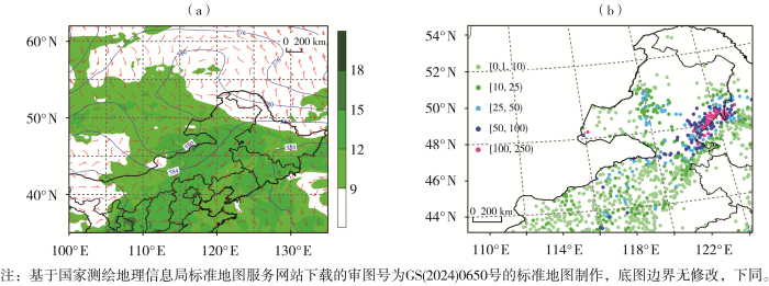 在高空槽东移和低空切变线共同影响下[图1(a)],2021年7月17日08:00—18日08:00(北京时,下同),内蒙古呼伦贝尔市东部发生一次大暴雨过程[图1(b)],共有28个国家级气象观测站出现大暴雨,其中呼伦贝尔市阿荣旗第十二生产队、兴安站、新发乡24 h累计降水量分别为167.2、135.0、134.4 mm。降水主要集中在17日20:00—18日08:00(图2),过程期间多次出现短时强降水(图3),降水强度大、局地性强,导致严重洪涝灾害。此次降水造成两座水库垮坝,受灾人数达16 660人,2 171 hm2农田被淹,22座桥梁损毁,影响极为严重。本文按照中央气象台气象业务一体化平台数值模式6 h累计降水产品显示将6 h 累计降水等级分为0.1 mm、4 mm、13 mm、25 mm、60 mm。