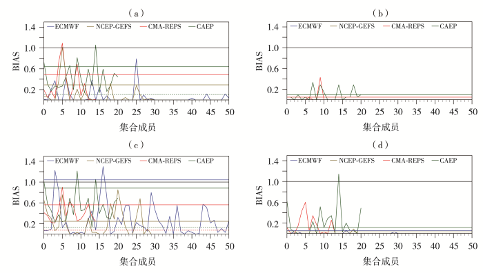 四类集合预报对2021年17日20:00—18日02:00(a、b)及18日02:00—08:00(c、d)25 mm(a、c)及60 mm(b、d)以上降水的BIAS评分
