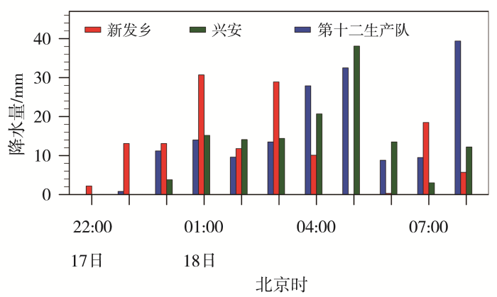 2021年7月17日22:00—18日08:00新发乡、兴安、第十二生产队逐小时降水量