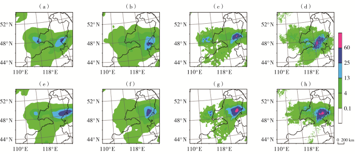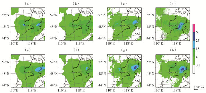 集合平均预报易受平滑效应影响,导致强降水落区偏小。频率匹配集合平均(Probability Matching Ensemble Mean,PM)通过使用集合成员的原始降水频率对集合平均进行修正以提高集合预报能力(Ebert,2001),可有效矫正平滑作用造成的小量级降水落区偏大、强降水被削弱的负面影响(李俊等,2015;叶茂等,2023)。2021年7月17日20:00—18日02:00的降水预报表明PM降水量级更接近实况[图6(a)、(b)、(c)、(d)]。其中,ECMWF PM降水准确预报了呼伦贝尔市东部和西部的两个强降水中心,中心降水强度超过25 mm;NCEP-GEFS PM降水仅预报出东部降水中心,且落区偏南;CMA-REPS PM降水虽预报出位于呼和伦贝尔东部超过60 mm的降水中心,但落区偏北;CAEP PM降水预报出60 mm的强降水,但漏报西部的强降水,东部降水中心落区偏南。18日02:00—08:00的PM降水预报[图6(e)、(f)、(g)、(h)],ECMWF PM降水依旧保持较好的落区预报,但降水量仍未达到60 mm;NCEP-GEFS、CMA-REPS和CAEP PM降水对呼伦贝尔东部降水中心的落区预报偏西,CMA-REPS和CAEP PM降水预报了60 mm以上的降水,其中CAEP PM降水对25 mm以上降水的落区预报更接近实况。