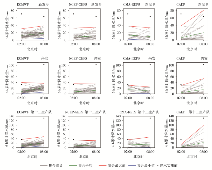 单站降水预报反映模式对局地降水的预报能力。此次降水过程中,兴安、新发乡和第十二生产队24 h累计降水量均超过130 mm。18日02:00—18日08:00单站逐6 h降水量预报结果(图7)显示,ECMWF、NCEP-GEFS和CMA-REPS新发乡逐6 h累计降水量普遍明显偏低,最大偏差约40 mm;18日02:00,CAEP逐6 h累计降水量偏低,但18日08:00有3个集合成员降水量预报为65 mm左右,与实况接近,预报能力较好。对于兴安和第十二生产队,ECMWF、NCEP-GEFS和CMA-REPS 18日02:00的预报降水量远低于实况,集合离散度降低,可预报性相对较低。相比之下,CAEP 18日08:00的预报结果与实况相差仅约30 mm,且成功预报了降水量增加的趋势。
