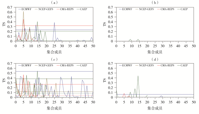 60 mm·(6 h)-1以上降水预报,17日20:00—18日02:00,ECMWF、NCEP-GEFS与CMA-REPS完全无预报能力,只有CAEP的个别成员表现出一定的预报能力;而18日02:00—08:00,NCEP-GEFS完全无预报能力,其他三种集合预报具有一定的预报能力,其中CAEP的预报能力最佳,多数成员TS评分超过0.100,最大可达0.440。ECMWF的PM降水预报效果最优TS评分为0.057,但也要低于CAEP部分集合成员。