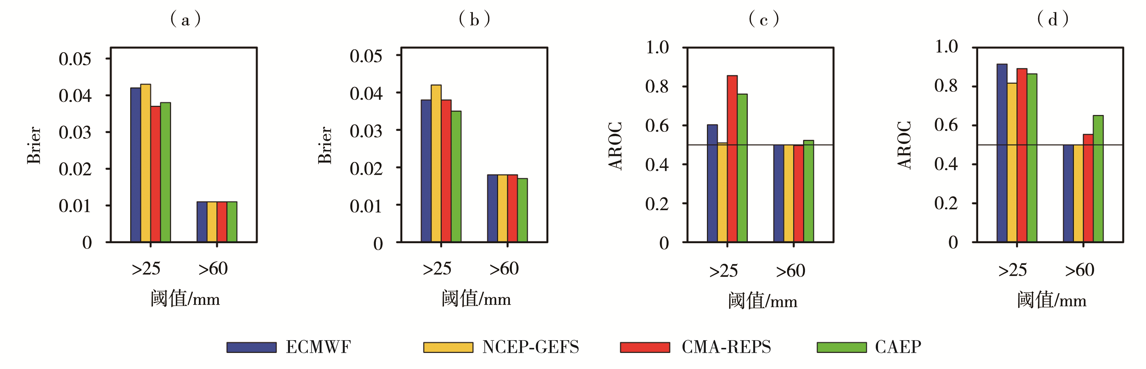 | Fig.11 Brier scores (a, b) and AROC scores (c, d) of the four ensemble forecasts for different precipitation categories from 20:00 on 17 to 02:00 on 18 (a, b) and from 02:00 to 08:00 on 18 (c, d) July 2021 (The horizontal line (AROC=0.5) denotes the threshold of forecast skill for distinguishing precipitation events) |