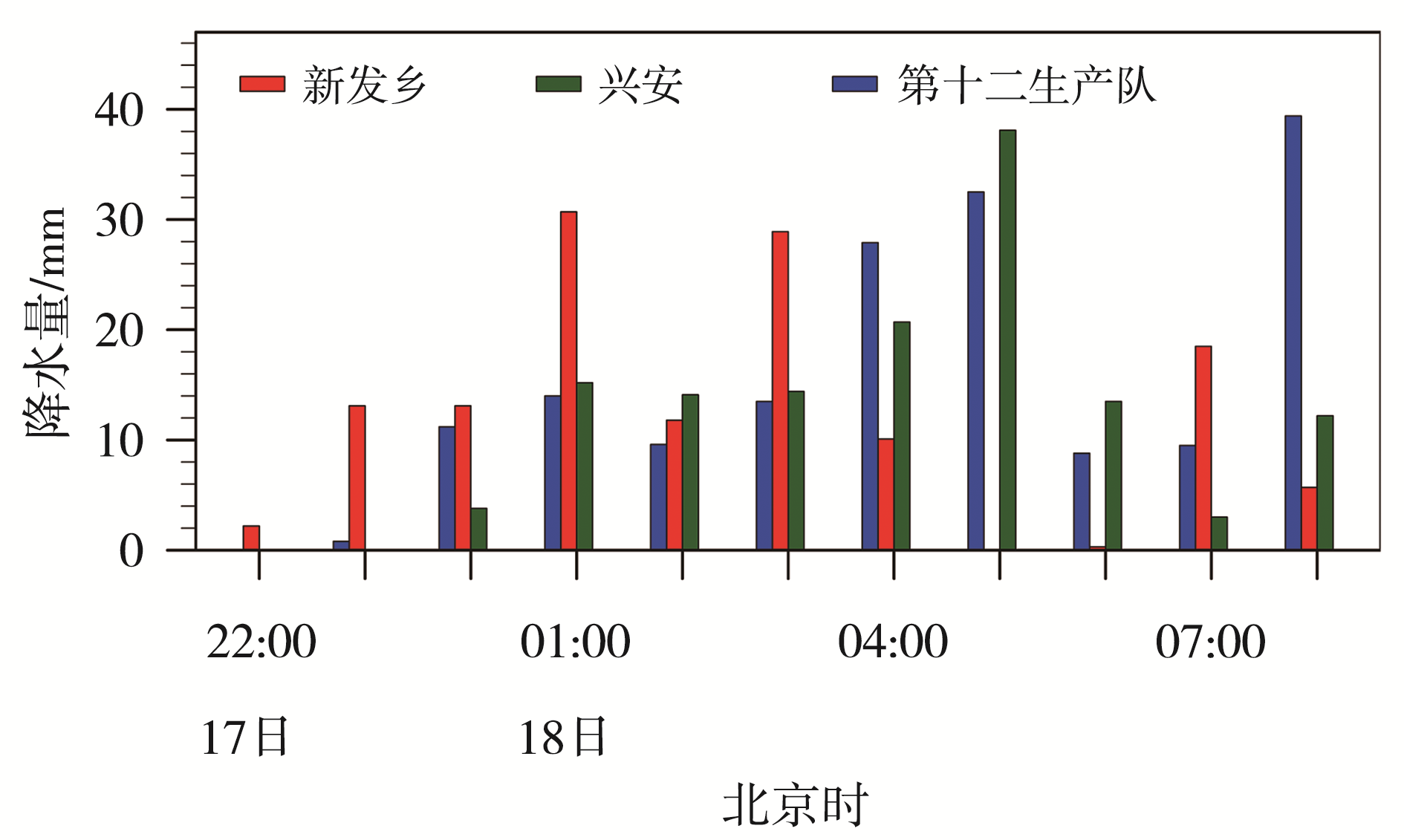 | 图3 2021年7月17日22:00—18日08:00新发乡、兴安、第十二生产队逐小时降水量 |