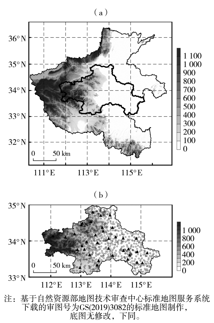 沙颍河流域地理位置(a)与流域国家站(黑色三角形)、区域站(空圆圈)及地形高度(阴影,单位:m)分布(b)
