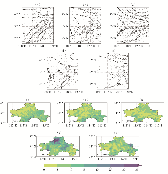 槽前西南气流型(a、f)、副高外围西南气流型(b、g)、西北气流型(c、h)、低涡切变型(d、i)及台风低压型(e、j)短时强降水700 hPa位势高度场(等值线,单位:dagpm)与风场(风矢量,单位:m·s-1)的合成场(a、b、c、d、e)及降水概率(单位:%)(f、g、h、i、j)分布