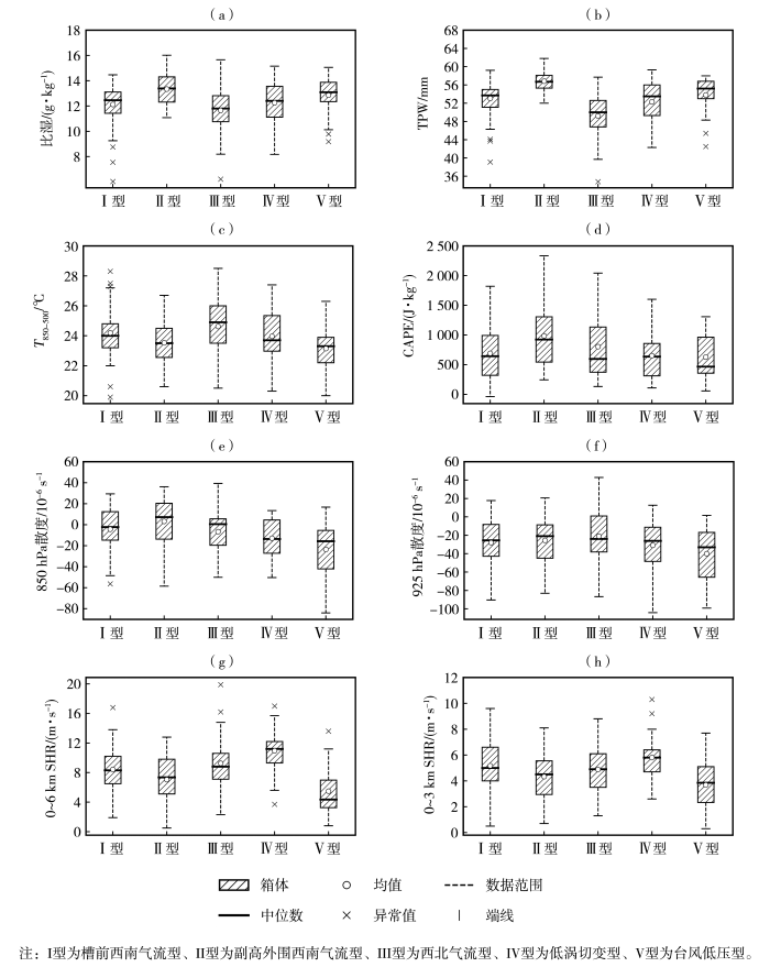Boxplots of 850 hPa specific humidity (a), TPW (b), temperature difference between 850 hPa and 500 hPa (c), CAPE (d), 850 hPa divergence (e), 925 hPa divergence (f), 0-6 km SHR (g) and 0-3 km SHR (h) under different circulation patterns of short-duration heavy precipitation in the Shaying River Basin