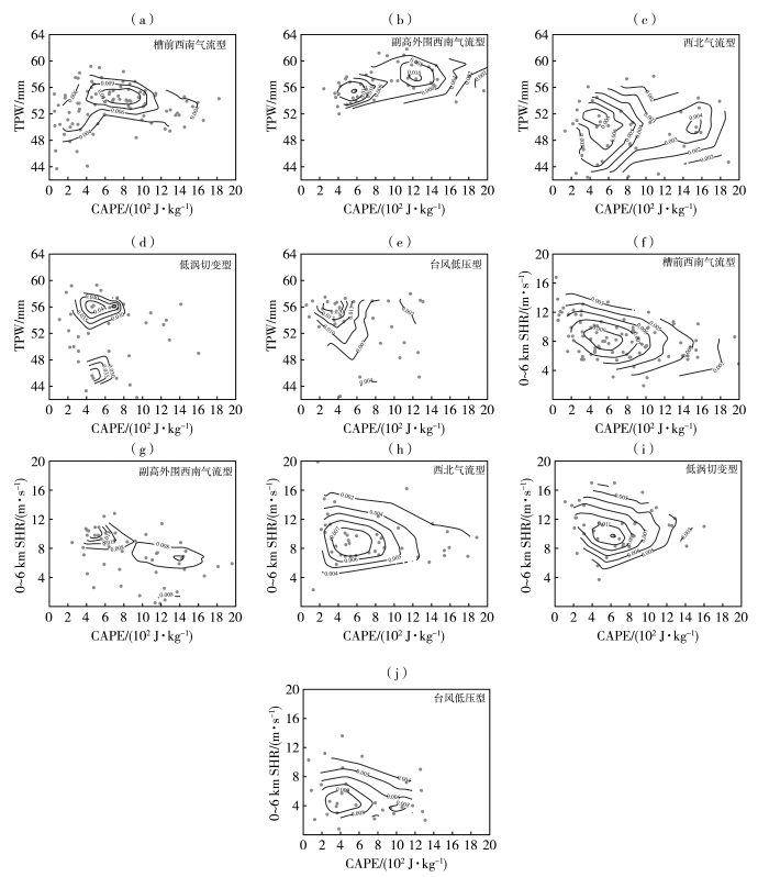 各型短时强降水的CAPE-TPW联合分布[图5(a)、(b)、(c)、(d)、(e)]显示,槽前西南气流型和台风低压型均只有一个高概率密度区,前者高概率密度区CAPE为400~1 000 J·kg-1,TPW为52~56 mm,中心位置CAPE约为750 J·kg-1、TPW为54 mm;后者高概率密度区CAPE为200~600 J·kg-1,TPW为54~58 mm,中心位置CAPE约为400 J·kg-1、TPW为56 mm,表明该型在低CAPE、高TPW条件下降水效率最高。副高外围西南气流型和西北气流型均表现为两个高密度区,前者两个中心的CAPE和TPW分别为550 J·kg-1、55 mm和1 200 J·kg-1、58 mm;后者两个中心的CAPE和TPW分别为500 J·kg-1、52 mm和1 500 J·kg-1、50 mm。这说明在低CAPE条件下可实现较高降水效率,但在特定条件下较高CAPE亦能产生高效降水。低涡切变型呈现两个中心区,对应CAPE均为500 J·kg-1,TPW分别为44~48 mm和52~56 mm,其中后者更为显著。