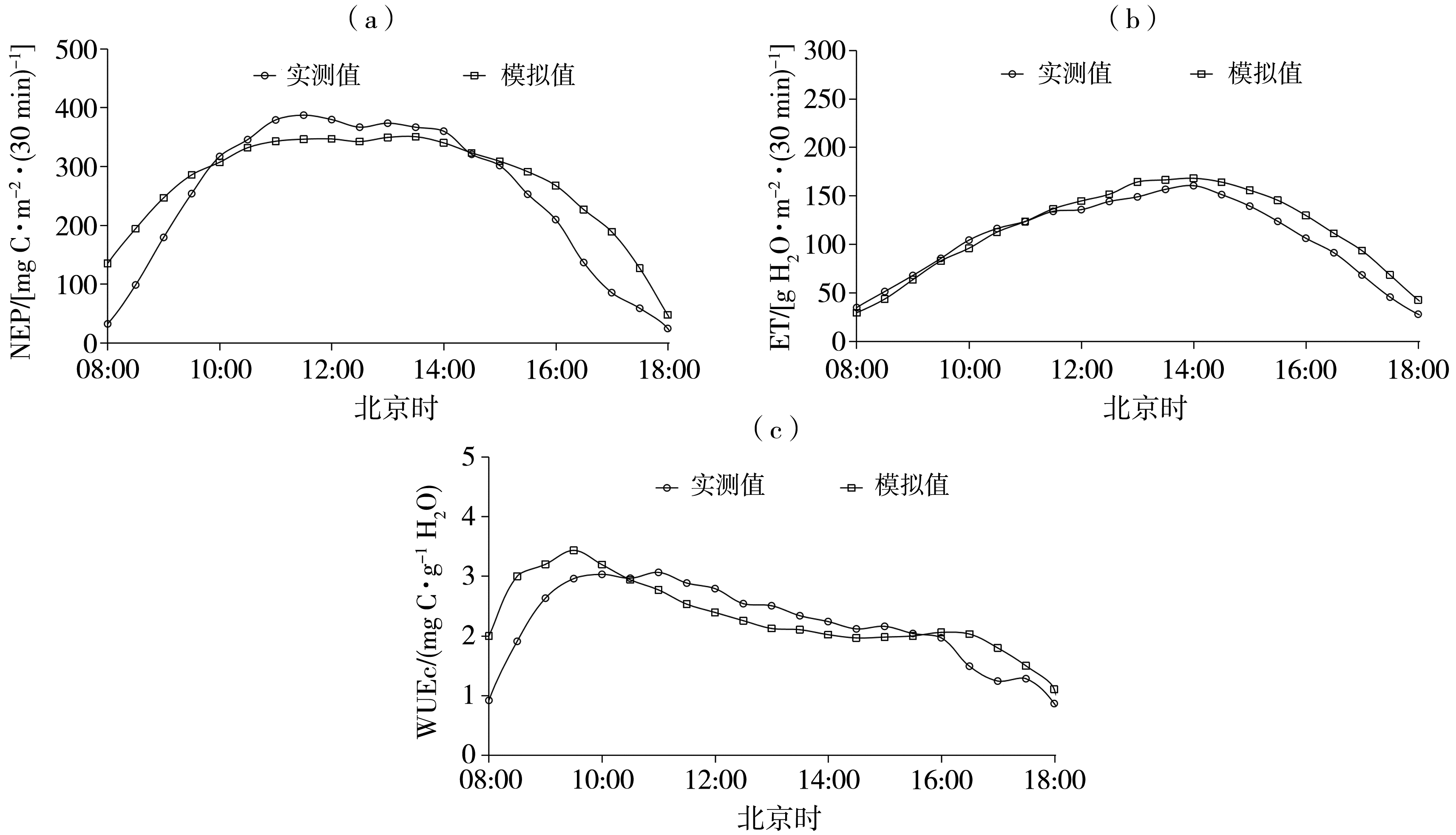 | Fig.2 Diurnal variations of observed and simulated values of NEP (a), ET (b), and WUEc (c) from the milk stage to the maturity stage of summer maize in 2017 |