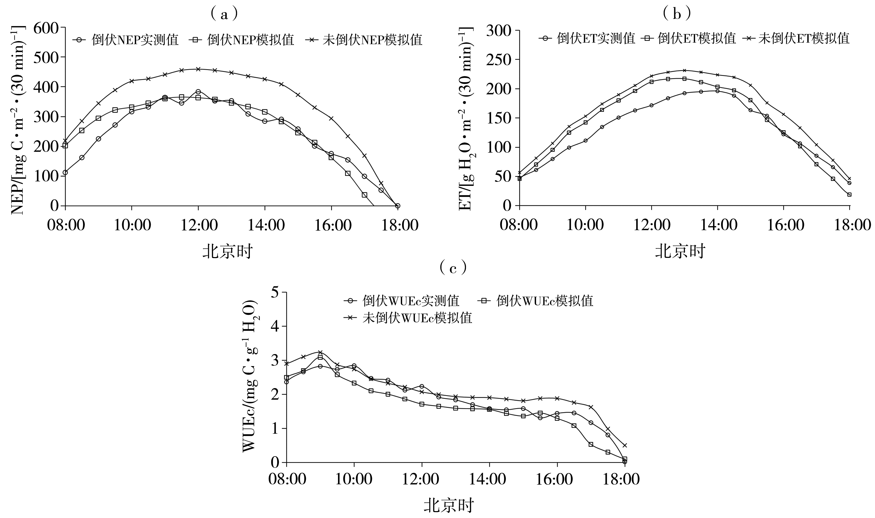 | Fig.3 Diurnal variations of simulated NEP (a), ET (b), and WUEc (c) for non-lodging summer maize, and the observed and simulated values after lodging from the milk stage to the maturity stage in 2016 |