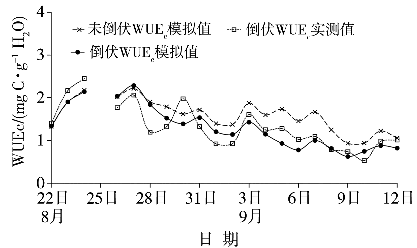| 图5 2016年夏玉米乳熟期至成熟期群体WUEc模拟值与实测值变化特征 |