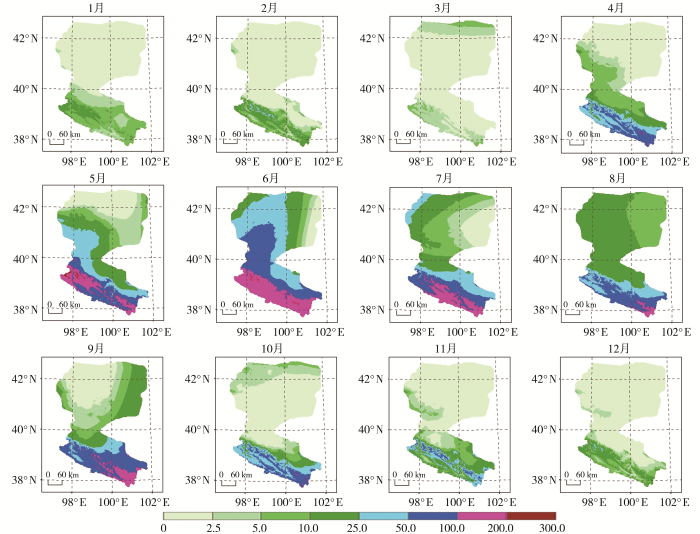 使用最优插值模型生成2019年黑河流域月降水量栅格数据。最优模型参数如下:独立变量为经度与纬度,协变量为海拔,样条次数为3,变量转换方式为平方根,站点数为40,DEM分辨率为1 000 m。在此基础上,利用ArcGIS平台将12个月的降水量栅格数据进行累加,得到年降水量栅格数据,并计算其像元平均值。2019年黑河流域平均降水量为211.39 mm,空间上自西南向东北递减(图2),与祁连山地形抬升效应一致。西南上游高海拔区(海拔>4 000 m)平均降水量达380.00 mm,而东北下游戈壁区(海拔<1 000 m)仅82.00 mm。1、2、3、12月降水量较少,月平均降水量分别为1.76、2.80、1.49、2.71 mm,降水量SE也较小。其中,3月降水量最少,仅有0.05~8.34 mm;自4月起,降水量超过25.00 mm的区域自西南向东北扩大;5月降水量大幅增加,月平均降水量为32.66 mm;汛期6—9月降水量较多,月平均降水量分别为56.48、29.63、24.05、26.84 mm,其中,6月降水量最大(0.13~238.00 mm),全流域降水量超过25.00 mm的区域占比最大(72.11%);之后,全流域降水开始逐渐减少,10、11月平均降水量分别为11.64、7.26 mm。