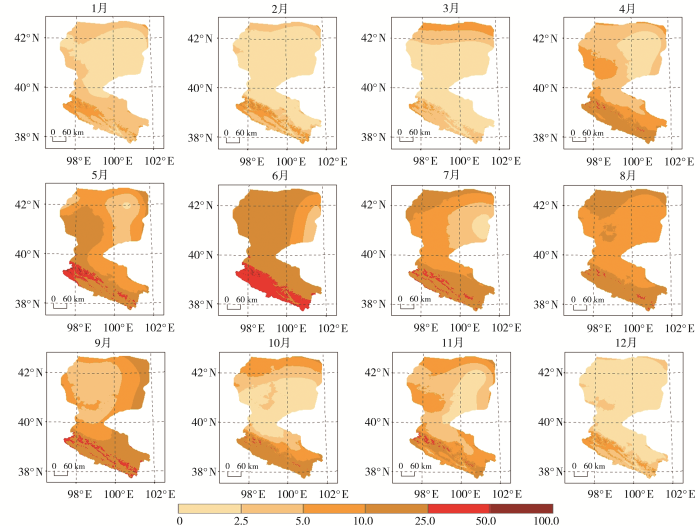 2019年黑河流域平均降水量SE为0.54~72.23 mm。降水量SE空间分异明显,黑河上游特别是上游西南地区SE较大,下游边界地区降水量SE较相邻地区大,主要是因为该区域气象和水文站点较少。1、2、3、12月降水量SE较小,为0.54~19.20 mm;5月降水量SE最大(72.23 mm);汛期6—9月降水量SE较大,其中6月降水量最多,SE≥25.00 mm的区域占比最大(14.81%),主要集中在降水量≥100 mm的区域。汛期6—9月降水量高值区(≥100 mm)的SE普遍高于非汛期,表明极端降水事件的插值不确定性更高。10、11月降水量SE≥10.00 mm的区域较汛期减少,但较降水量较少的1、2、3、12月大(图3)。