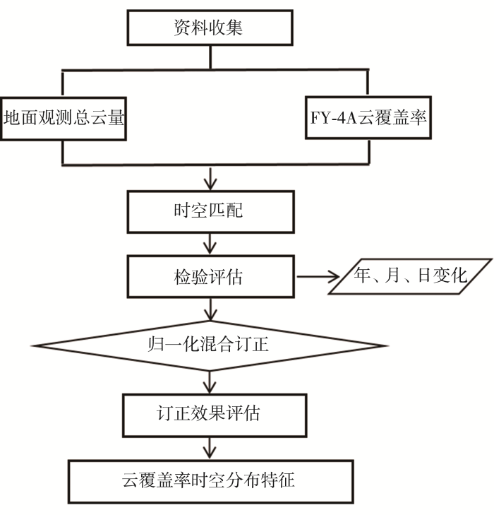 收集2019年地面观测总云量与FY-4A卫星云覆盖率数据,对两者进行时空匹配,系统评估云覆盖率产品在年、月、日尺度上的变化特征与观测一致性。采用归一化混合订正法对逐月云覆盖率产品进行订正,并在此基础上分析宁夏地区日间云覆盖率的时空分布特征。总体技术流程如图2所示。