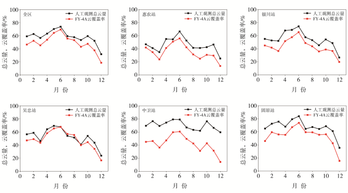 各代表站总云量及云覆盖率逐月变化规律与全区平均基本一致,吴忠站的吻合效果最好,3—9月FY-4A云覆盖率与人工观测总云量基本一致,而中卫站两者误差较大,各月偏差为20%~45%。中卫站地处宁夏中西部,位于腾格里沙漠东南缘,受沙漠、戈壁地貌影响,地表反射率较高,其与低云的反射率差异缩小,卫星云检测算法在区分高反射地表与低云时容易产生误判;另外,该区域春季多沙尘天气,沙尘气溶胶与云粒子的光学特性相似,进一步增加了云检测的复杂性。两者对云覆盖率的具体影响机制有待进一步深入研究。