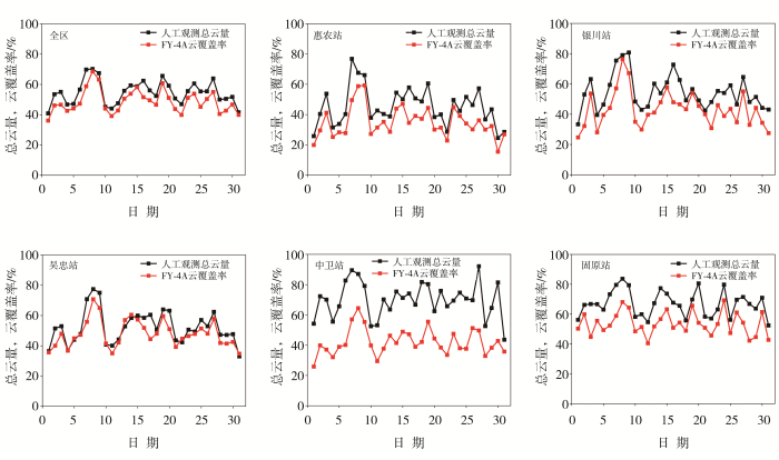 Daily variation of total cloud amount and FY-4A cloud cover fraction in Ningxia and five representative stations in 2019